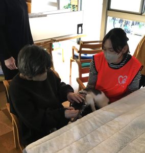 ワンちゃんやネコちゃんの癒しの力に引き寄せられ、「昔、家でも飼っていたのよ」「かわいいね」などと話しながら、