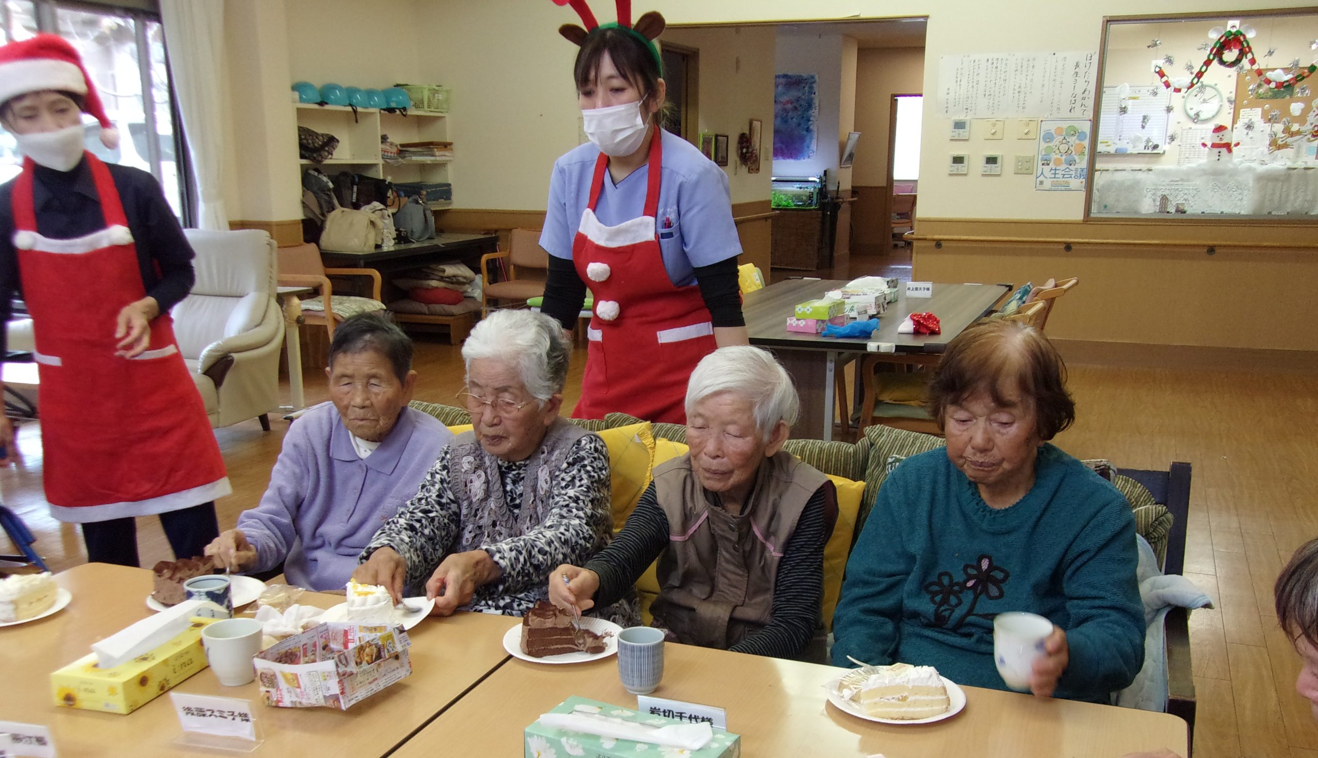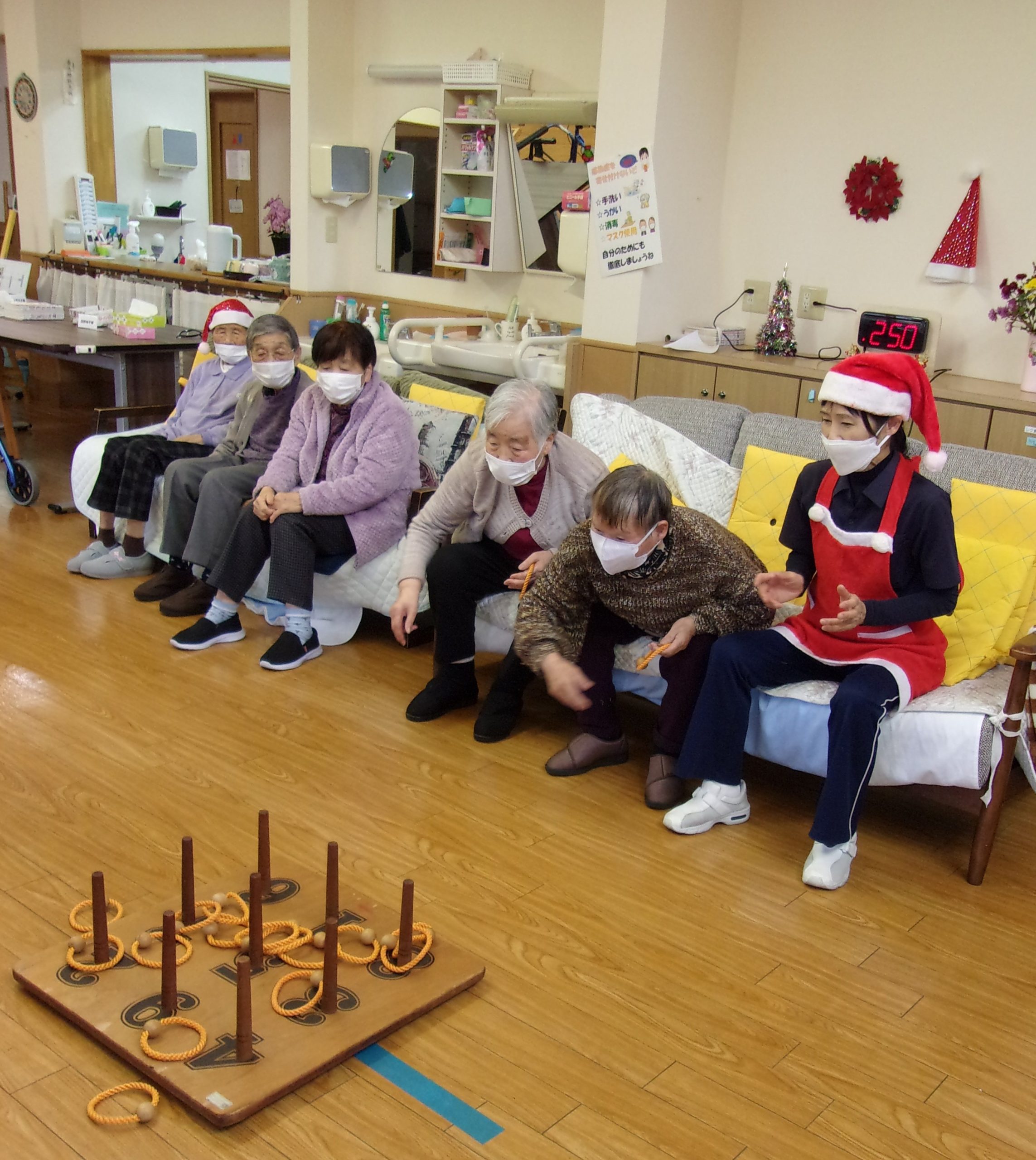 クリスマスと忘年会を行い、玉入れや輪投げの対抗戦ゲームで体を動かしながら、みなさんで楽しい時間を過ごしました。