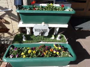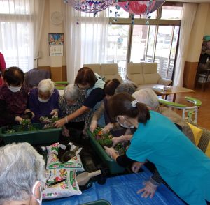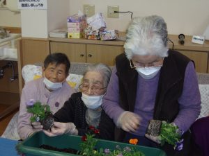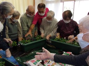 Xmasやお正月に向けて、玄関の花を利用者様と一緒に新しく植え替えました。
