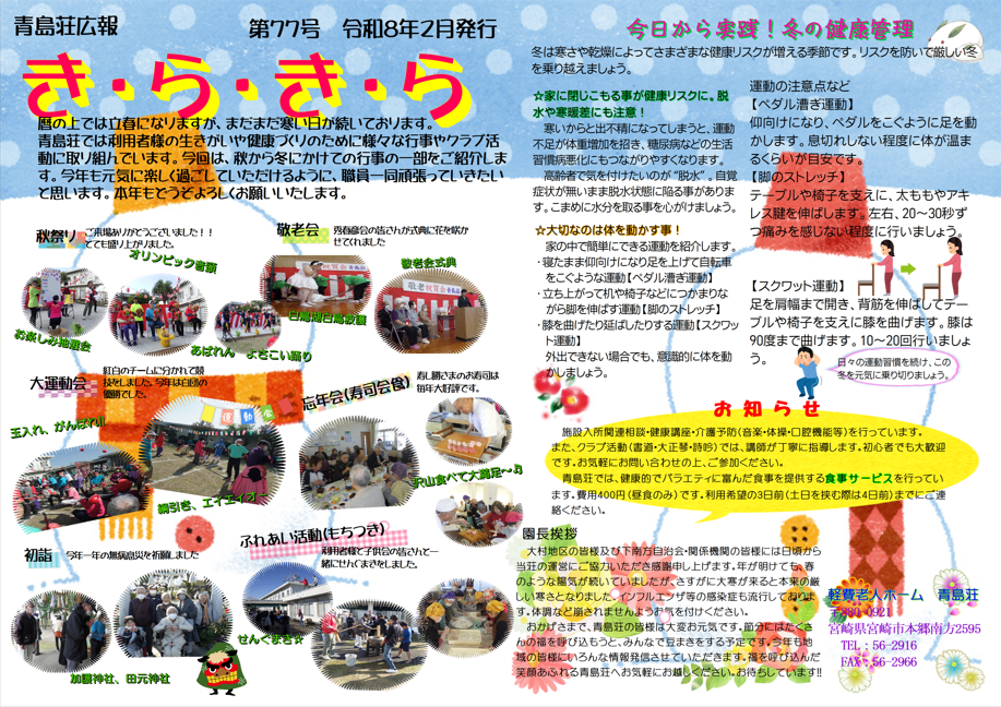 青島荘のミニコミ誌「きらきら第77号」を発行しました。日々の活動の様子やプチ情報を掲載しております。どうぞご高覧ください。