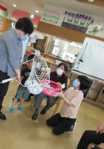 手首につけた花飾りで赤・白チームに分かれ、子どもたちと協力しながら3つのゲームを行いました。