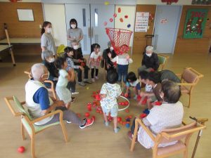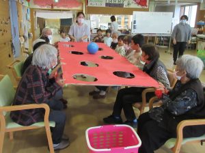 手首につけた花飾りで赤・白チームに分かれ、子どもたちと協力しながら3つのゲームを行いました。