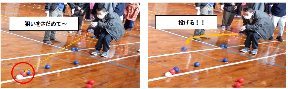 『ボッチャ』はまず、先攻・後攻を決めチームごとに赤ボール、青ボールを使用します。ジャックボール(目印になる白いボール)をセットし、両チームが交互に6球ずつを投げ合い、最終的にジャックボールに一番近い位置にボールを寄せたチームが勝利となるゲームです。