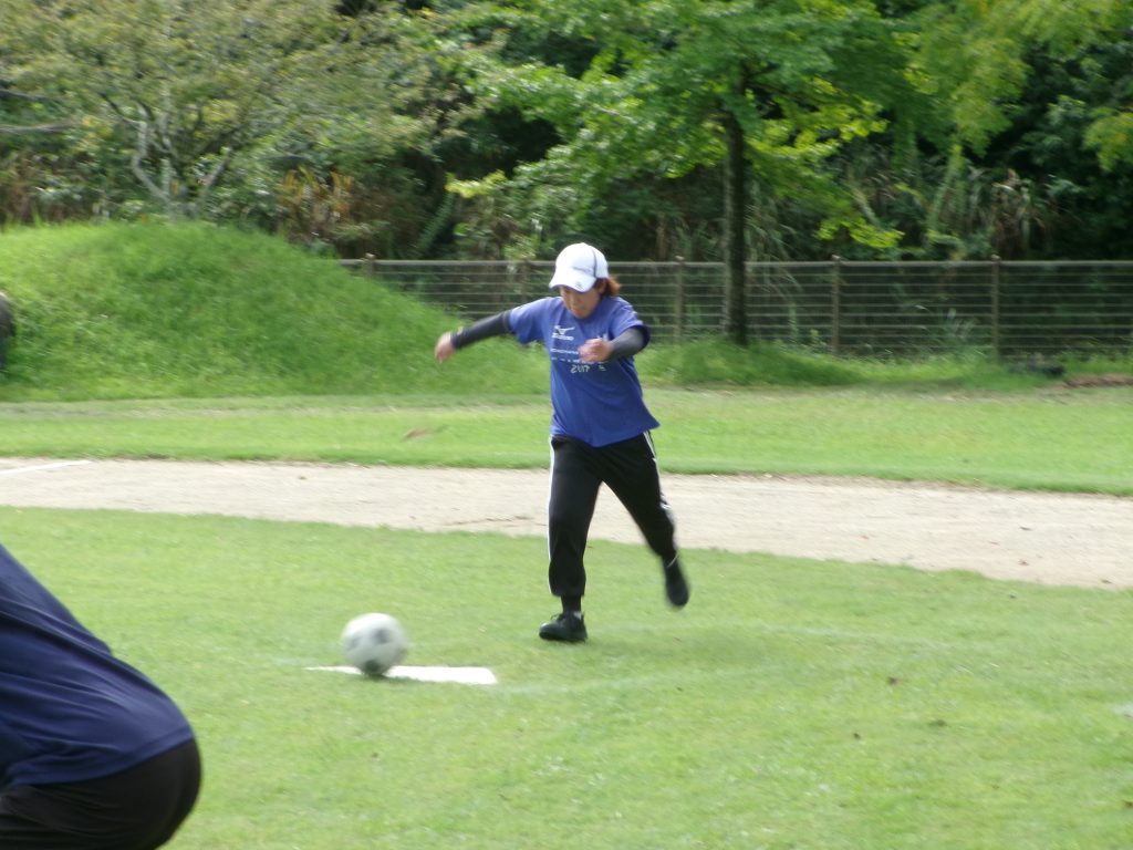 フットソフトボールは、一般のソフトボールのルールを基本とし、バットやグローブを使わず、投手がサッカーボールを転がし、キッカーが蹴ってベースを走る競技で性別やスポーツ経験に関係なく楽しめます。
