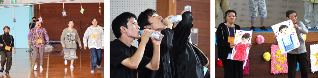 楽しい昼食の後は、菓子食い競争、ラムネ早飲み大会、多感覚セッション参加者の活動披露を行い、会場全体が活気に満ち溢れていました。