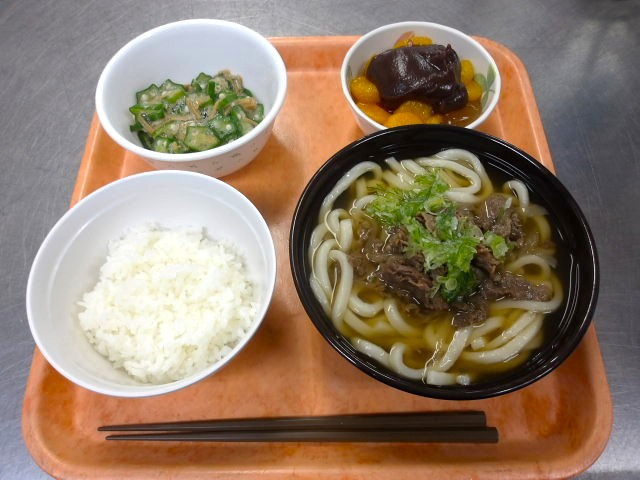 肉うどん、オクラのなめたけ和え、手作りフルーツあんみつでした!