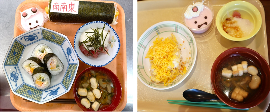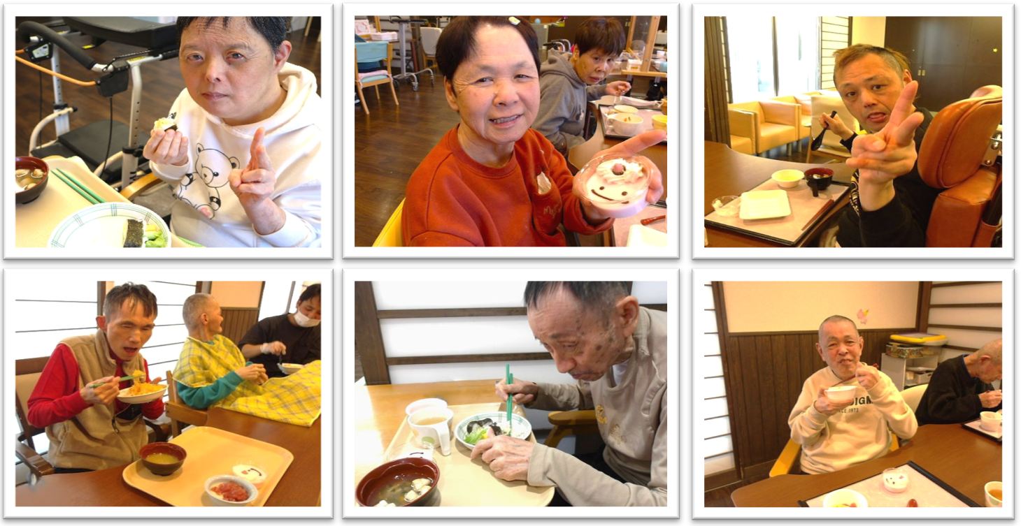 2月の行事食では、利用者様向けに職員手作りの恵方巻をご用意しました。具材の彩りもよく、普段なかなか提供できない巻きずしに、皆様とても嬉しそうに舌鼓を打っておられました。
