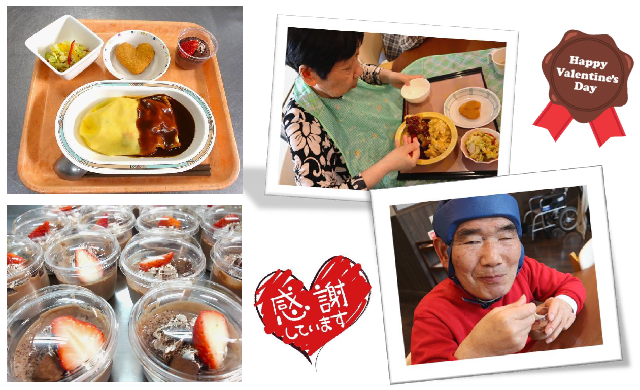 バレンタインには、かわいらしいハート形のコロッケや手作りデザートをご用意しました。