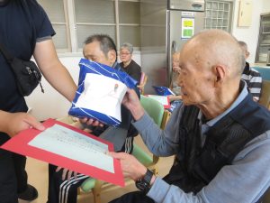 式典に出席された利用者様には、担当職員からのメッセージ入り感謝状と記念品をお渡しし、嬉しそうに受け取られていました。